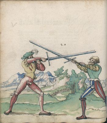 Illustration issue d’un traité de Peter Von Danzing, glossateur de Liechtenauer. Cette pièce explique commet dévier un estoc depuis la garde de la charrue avec un coup lorgnant (schielhau).