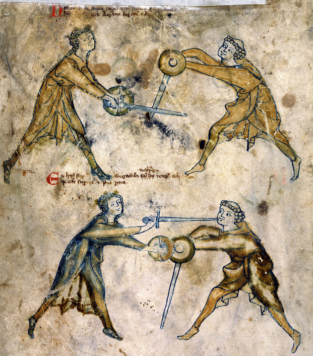 Illustration issue du 3e assaut de Marozzo, traitant de la demi-épée. Selon lui la meilleure partie de l’escrime qui doit être maîtrisée par les bon·nes escrimeur·euses et celleux qui enseignent l’escrime.